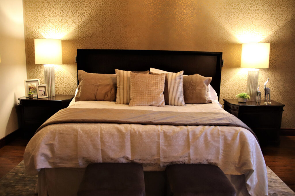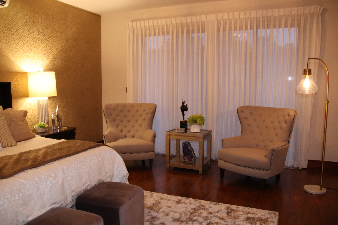 Sillones, mesas auxiliares, almohadones, iluminación cálida y elementos atrevidos, como la pared pintada a mano detrás de la cama, hacen de este dormitorio el lugar perfecto para descansar con estilo.
